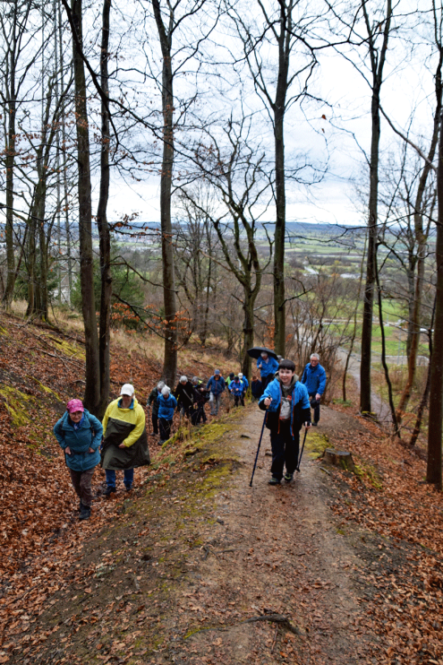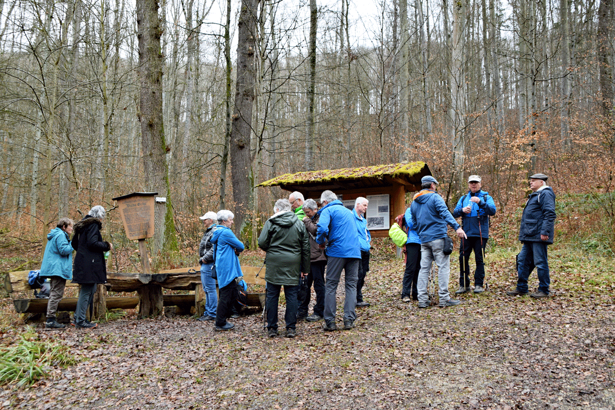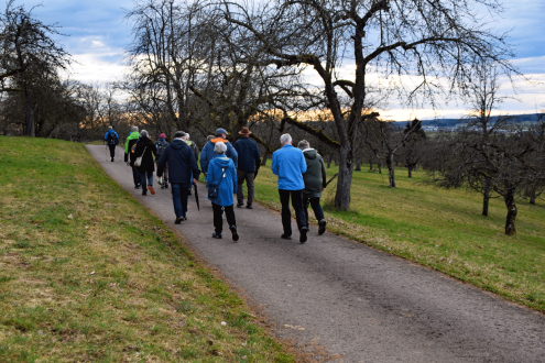 Weiter über das schmale Jägerwegle hinaus an den Nordrand des Waldes, wo entlang des Weges, die Bäume des Jahres der letzten 30 Jahre zu sehen sind. Einige mussten neu gepflanzt werden andere haben sich gut entwickelt. Die Bestimmung ohne Laub ist anspruchsvoll, doch helfen die Hinweisschilder auch dem Unkundigen die Baumarten zu erkennen. Nach einer Einkehr führte der Weg durch das Nehrener Kirschenfeld zurück zum Ausgangspunkt der Wanderung. Die Wanderung wurde von Carmen Leipp gekonnt geführt und sehr gut vorbereitet.