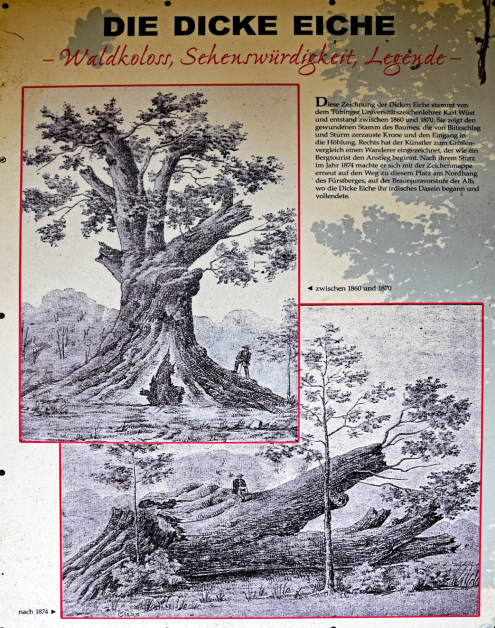 Auf der Ebene des Firstbergs bei den Gebäuden der Bodenseewasserversorgung und am Schloßbuckel auf dem die Burg First aus dem 12. Jahrh. stand boten sich herrliche Ausblicke auf die gegenüber liegenden Albberge Bol- Filsen- Farren- und Roßberg und die Orte Öschingen und Talheim. Ganz klein schaute sogar die Salmendinger Kapelle über die Waldgipfel in der Ferne. Durch schöne Buchen-Eichenwälder führte der Weg weiter zur „Dicken Eiche“ einem verschwundenen ca. 700 jährigen Traubeneichen-Koloss, der im 19. Jahrh. bei einem Gewitter zusammenbrach, und von dem heute nichts mehr als ein kleines Holzstück an der Infotafel übrig ist.